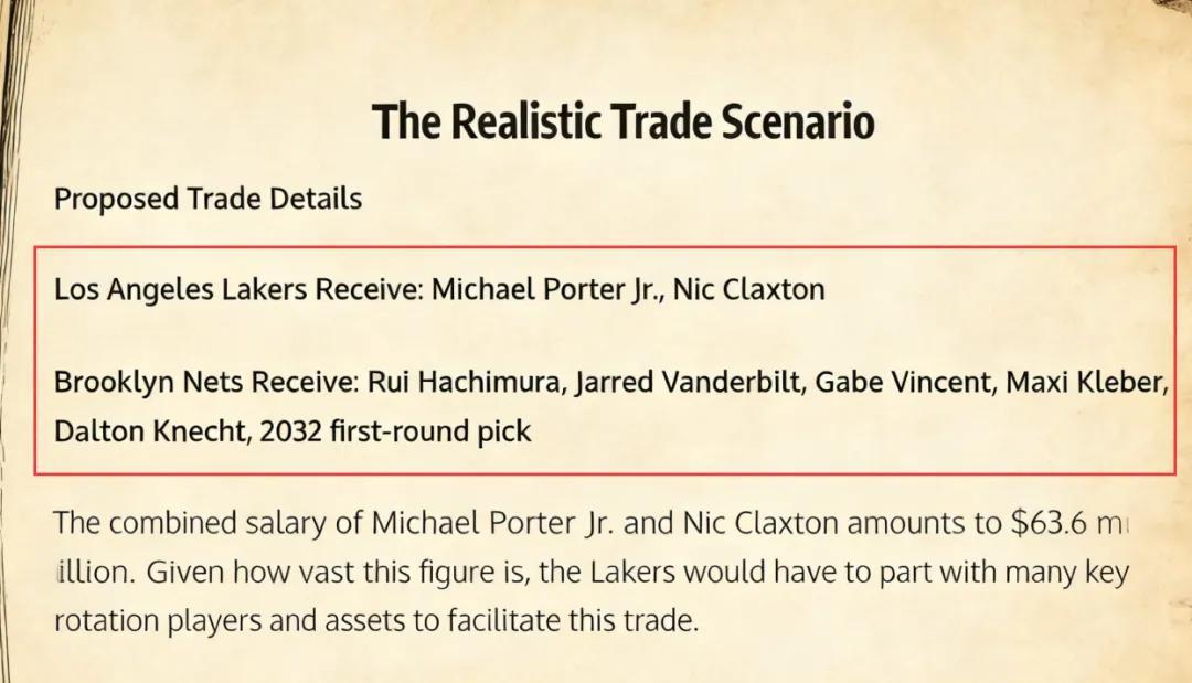 美媒《Fadeaway World》撰文建议,湖人可以将八村垒、范德比尔特、文森特、克莱伯、克内克特以及2032年的首轮签送到篮网,换回前锋小波特和内线克拉克斯顿