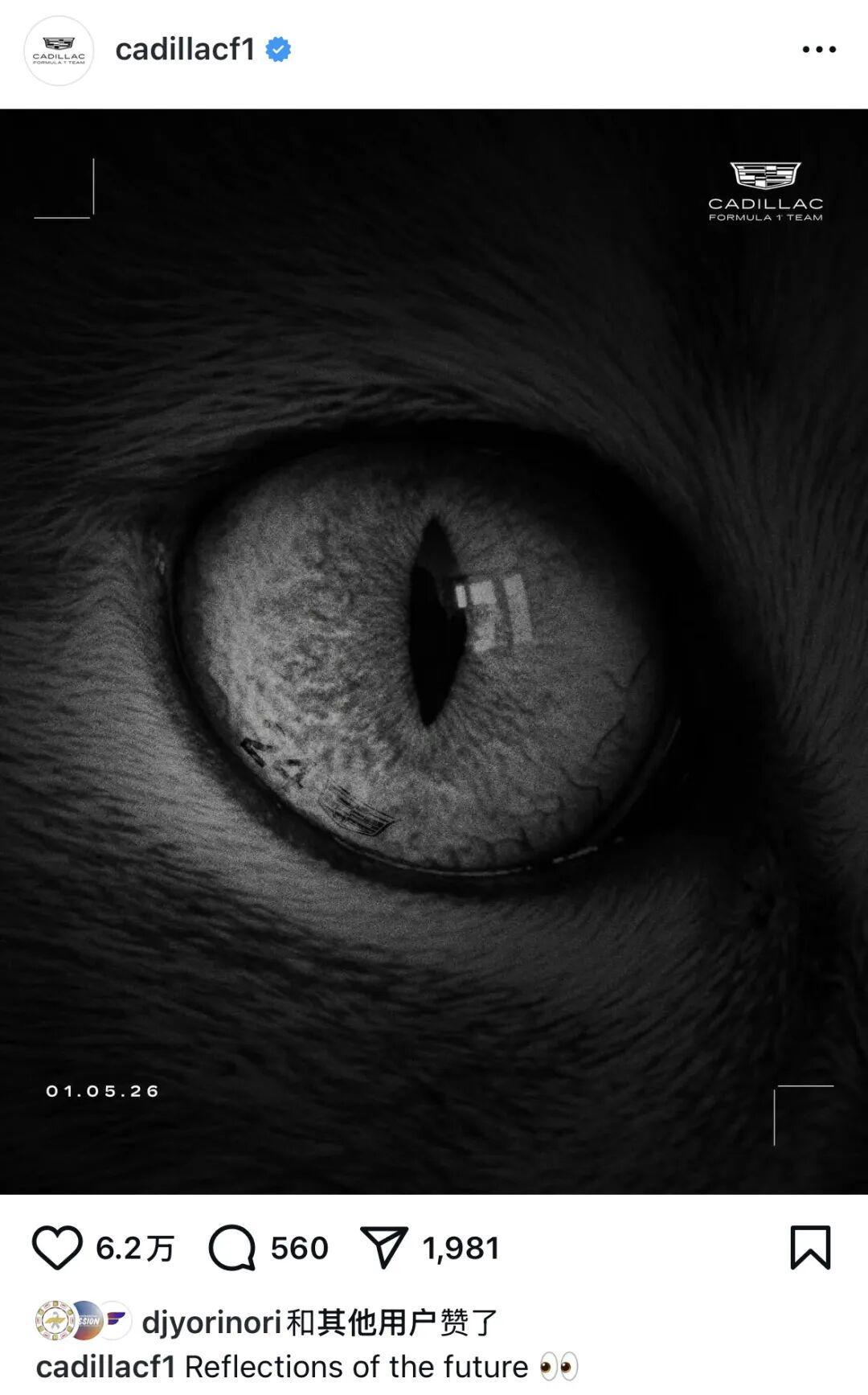 在北京时间昨天晚间,凯迪拉克车队在其官方社交媒体账号发布动态,内容为一只猫科动物的眼部黑白特写,照片整体左下侧印有“2026年1月5日”的具体时间,并配文“未来的倒影”。