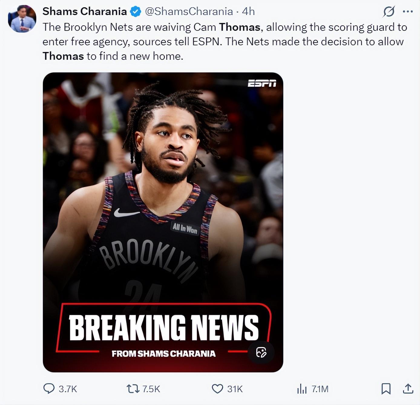 北京时间2月6日,根据ESPN记者Shams报道,篮网队已经裁掉了卡梅隆-托马斯。随后托马斯在个人社媒发声:我的下一支球队将得到一名顶级得分手、优秀的组织手以及一位出色的双能卫。