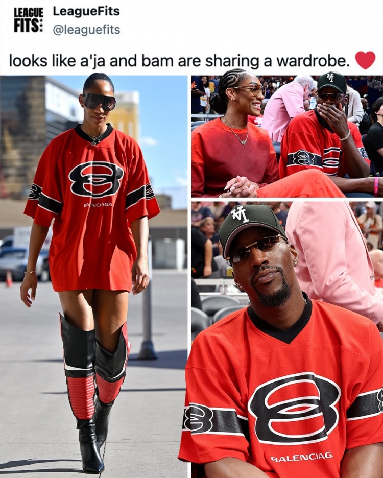 9月9日讯 潮流媒体Leaguefits晒出了WNBA球星阿贾-威尔逊的最新穿搭,她上身的这件球衣款式的上衣,此前阿德巴约也有上身过。Leaguefits配文评论到:“那些共用衣柜的情侣,会一直在一起。”