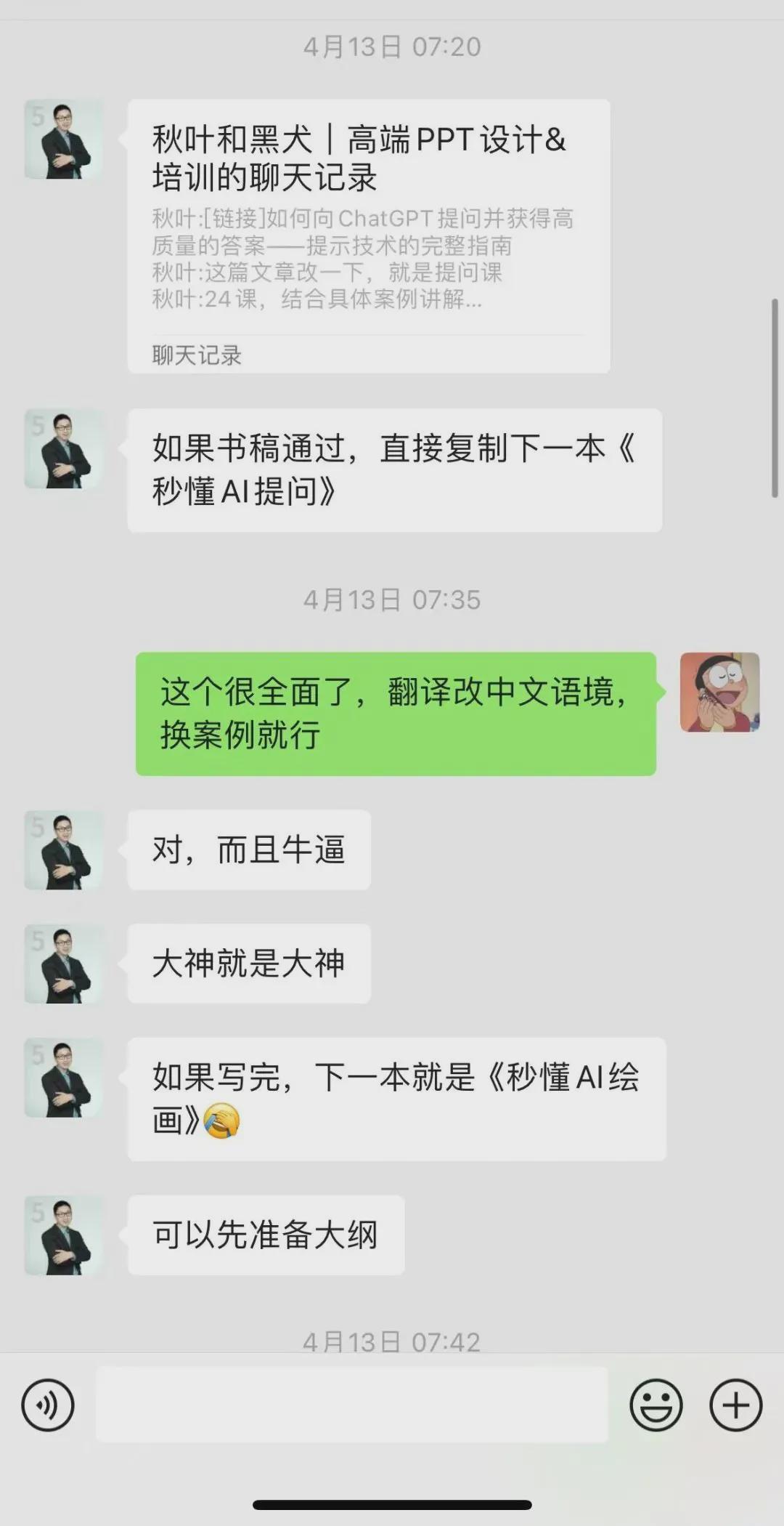 4月13号提交完《秒懂AI写作》初稿,我一分钟都没让小伙伴闲着。立马开《秒懂AI提问》立项会,顺便讨论大纲,开干!