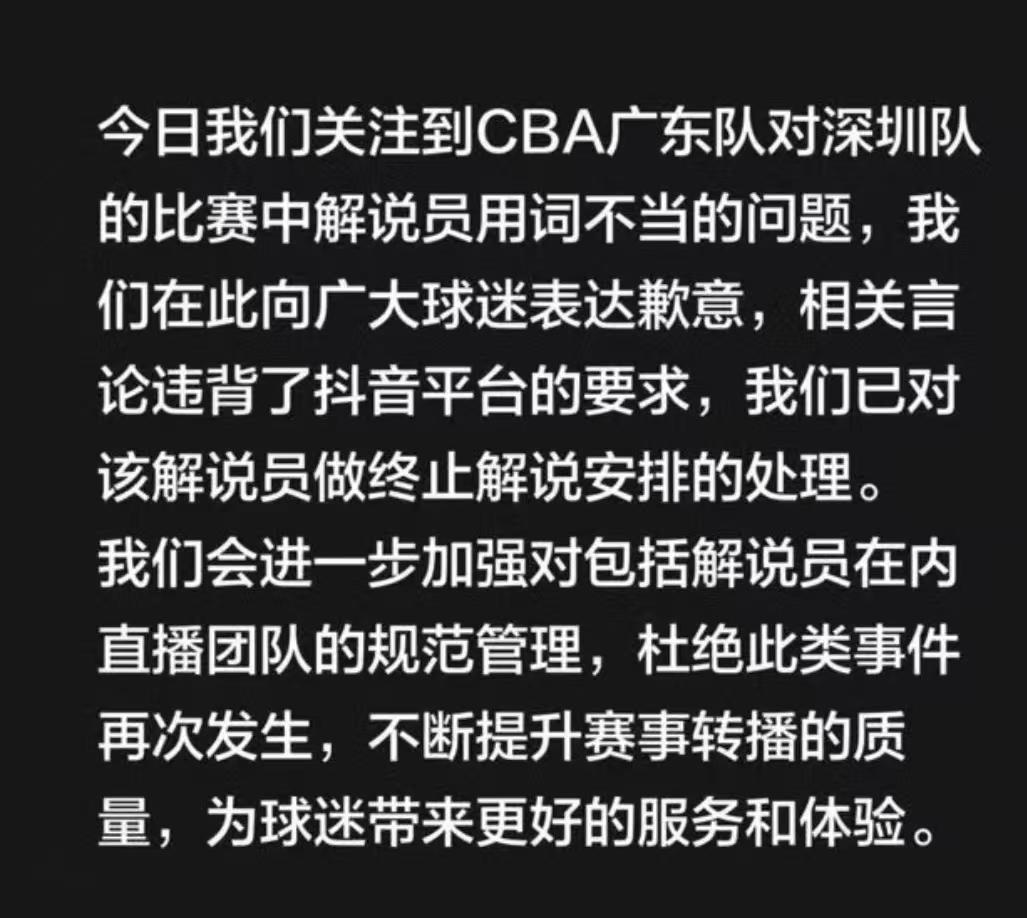 开云APP-深夜12点!抖音体育公开向广东队道歉,解说员用词不当遭终止解说