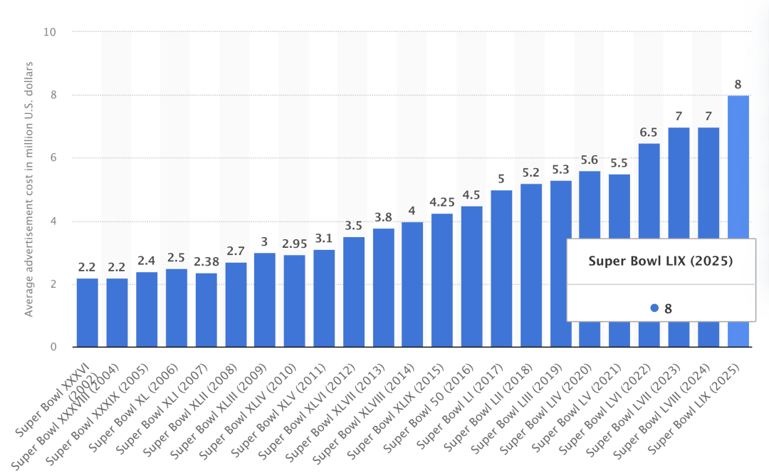 除此之外,赛中广告也同样是外界关注的焦点,即便在2025年的超级碗,平均每30秒的广告投放所需要的金额已经达到800万美元的量级,但超级碗作为世界体育的现象级标杆,仍旧是一众品牌青睐的平台。根据相关数据统计,赛后就单单是广告本身在视频平台的浏览量就能超过数百万,而平均每名观众在没有帮助的情况下,更是能回忆起3.5个出现在超级碗的广告商。